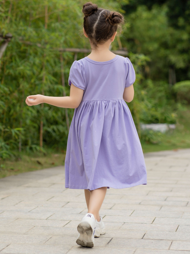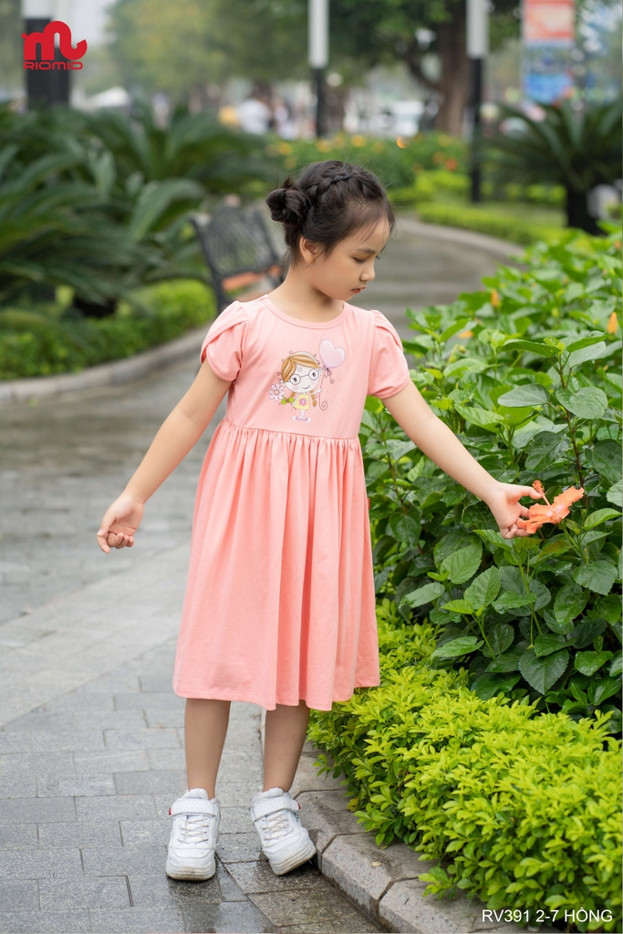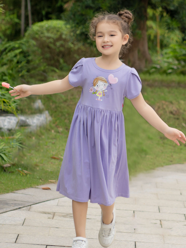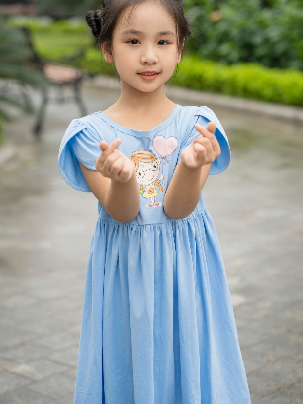 Phom rộng rãi, dáng xòe, bé mặc thoải mái vui chơi.